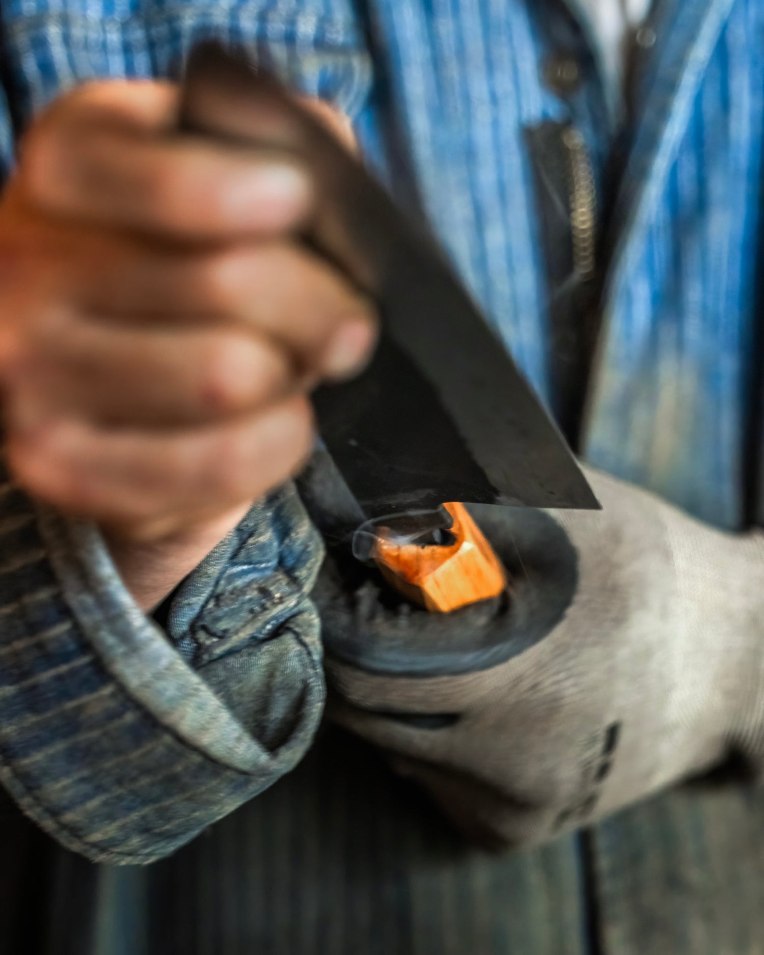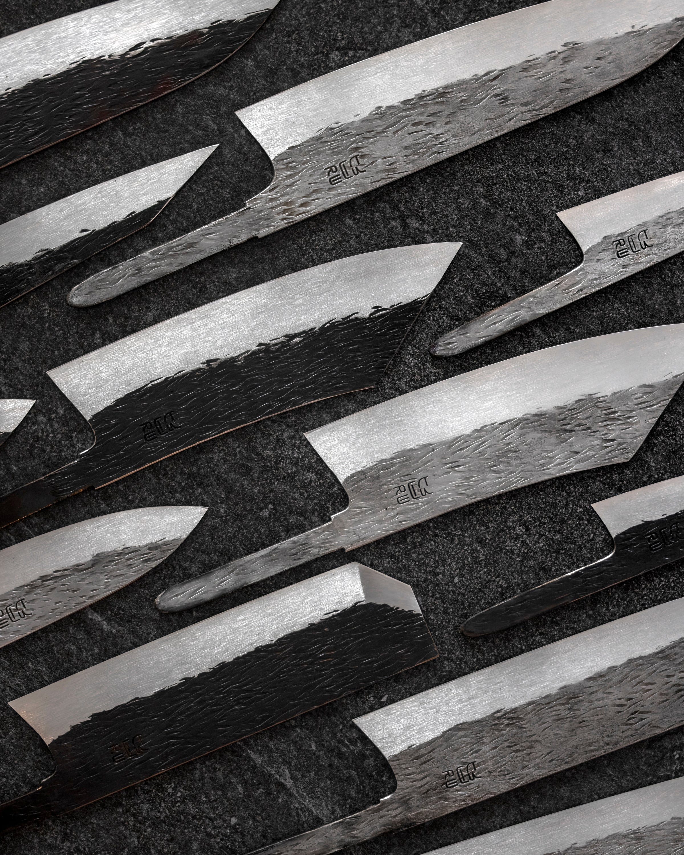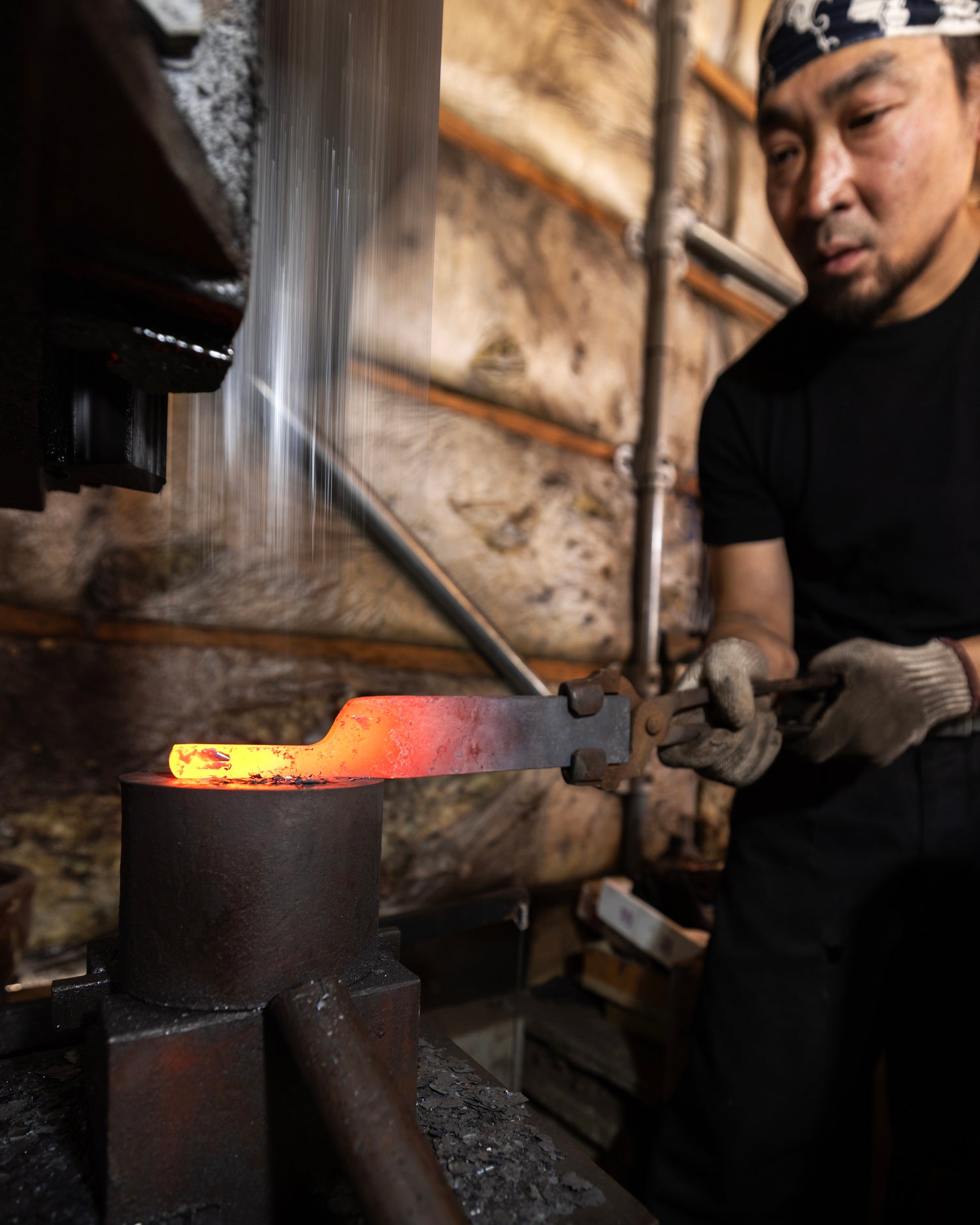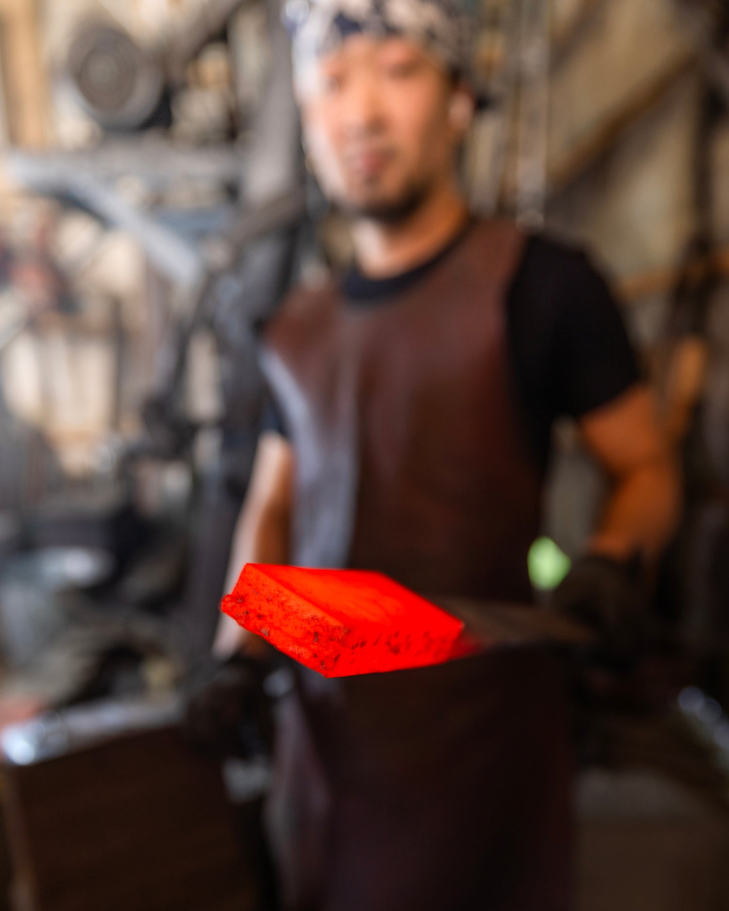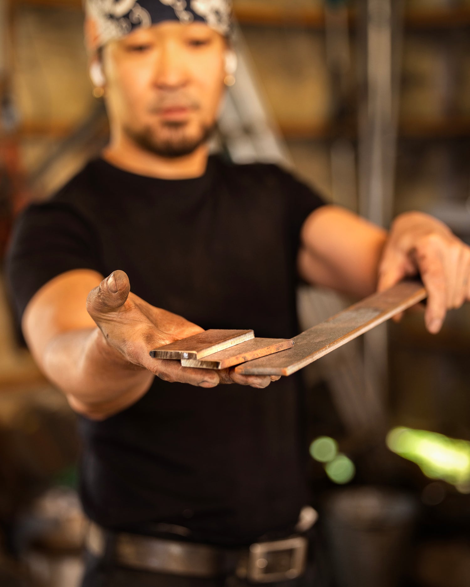 Le processus débute par la fusion de trois couches d’acier : une couche centrale en acier à haute teneur en carbone (鋼) pour assurer un tranchant exceptionnel, encadrée de deux couches extérieures en acier inox (地鉄). Cette structure en couches confère à la lame une combinaison idéale de dureté et de flexibilité, facilitant l'affûtage et augmentant la durabilité.