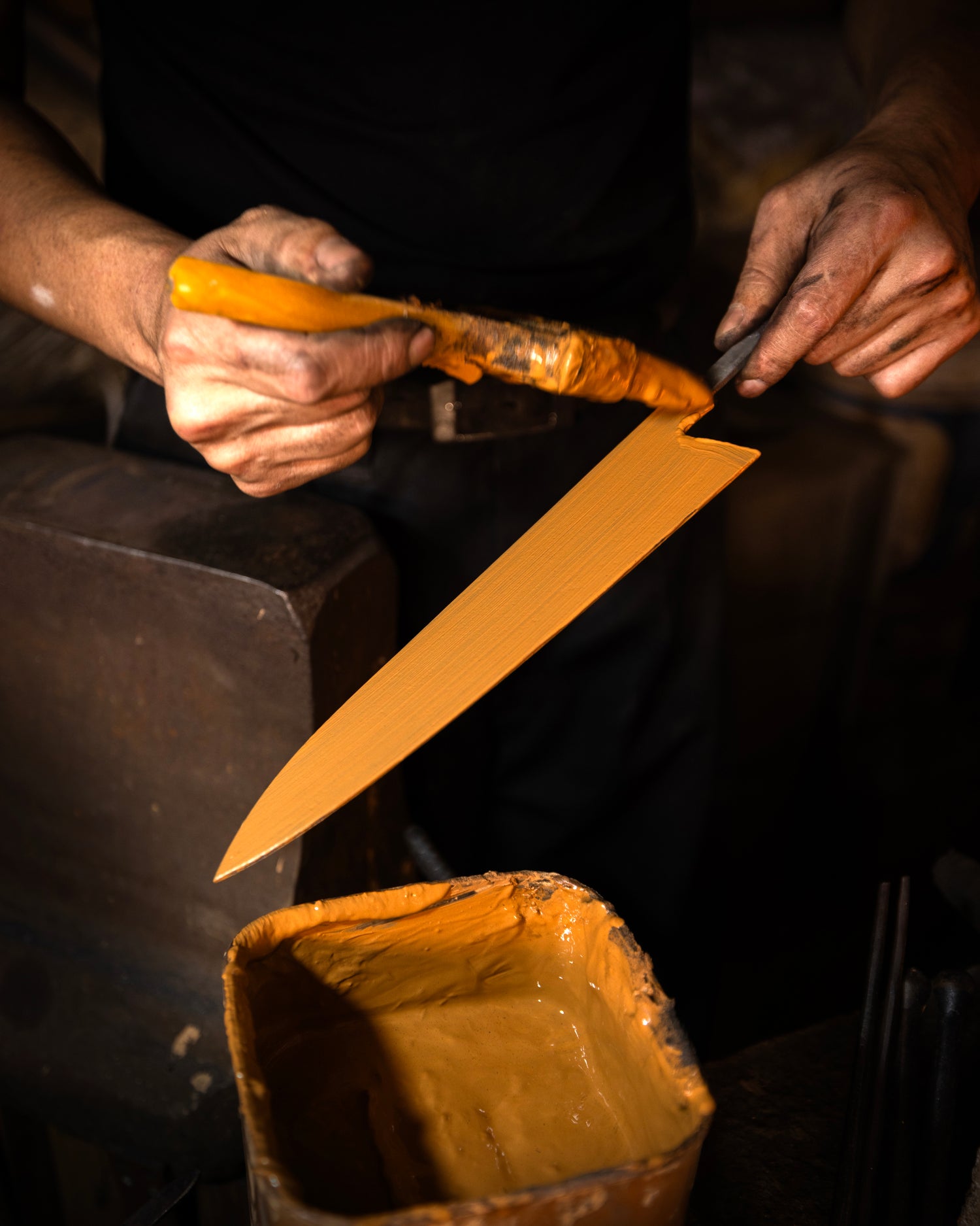 La lame est chauffée à une température spécifique, puis rapidement trempée dans l'eau pour durcir l'acier. Ce processus confère à la lame sa dureté caractéristique.