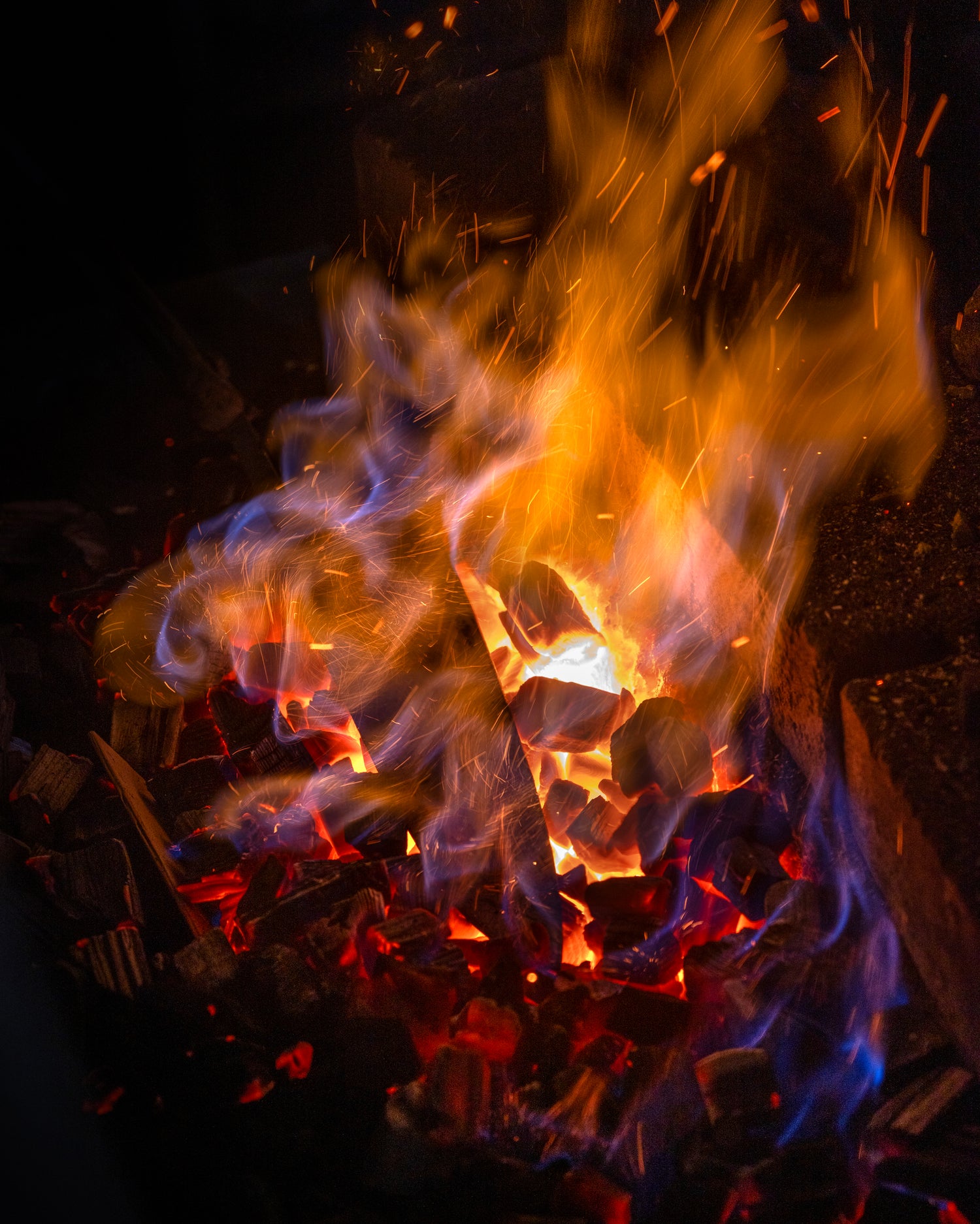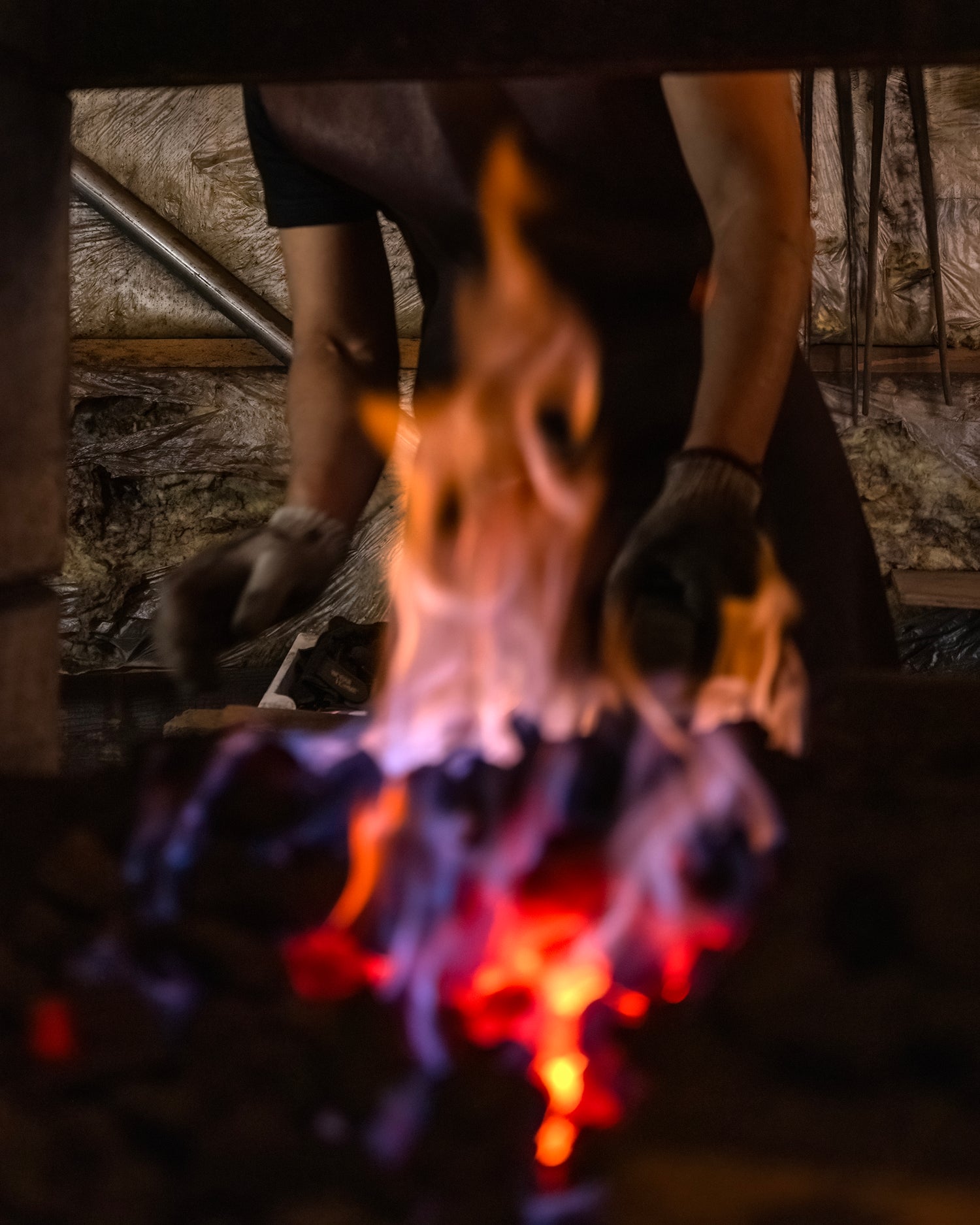La qualité du feu de forge repose sur une sélection minutieuse du combustible. Le charbon est d’abord découpé en morceaux de taille uniforme, généralement calibrés selon les besoins spécifiques de la chauffe. Des fragments trop gros ralentiraient la montée en température, tandis que des morceaux trop fins brûleraient trop vite, générant des cendres et des impuretés indésirables. Ce calibrage précis assure une combustion régulière et un apport constant de chaleur, condition essentielle pour atteindre les températures élevées nécessaires au travail de l’acier, tout en maîtrisant l’atmosphère du foyer pour éviter l’oxydation des pièces en cours de forge.