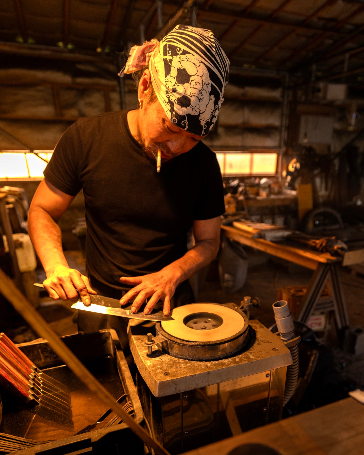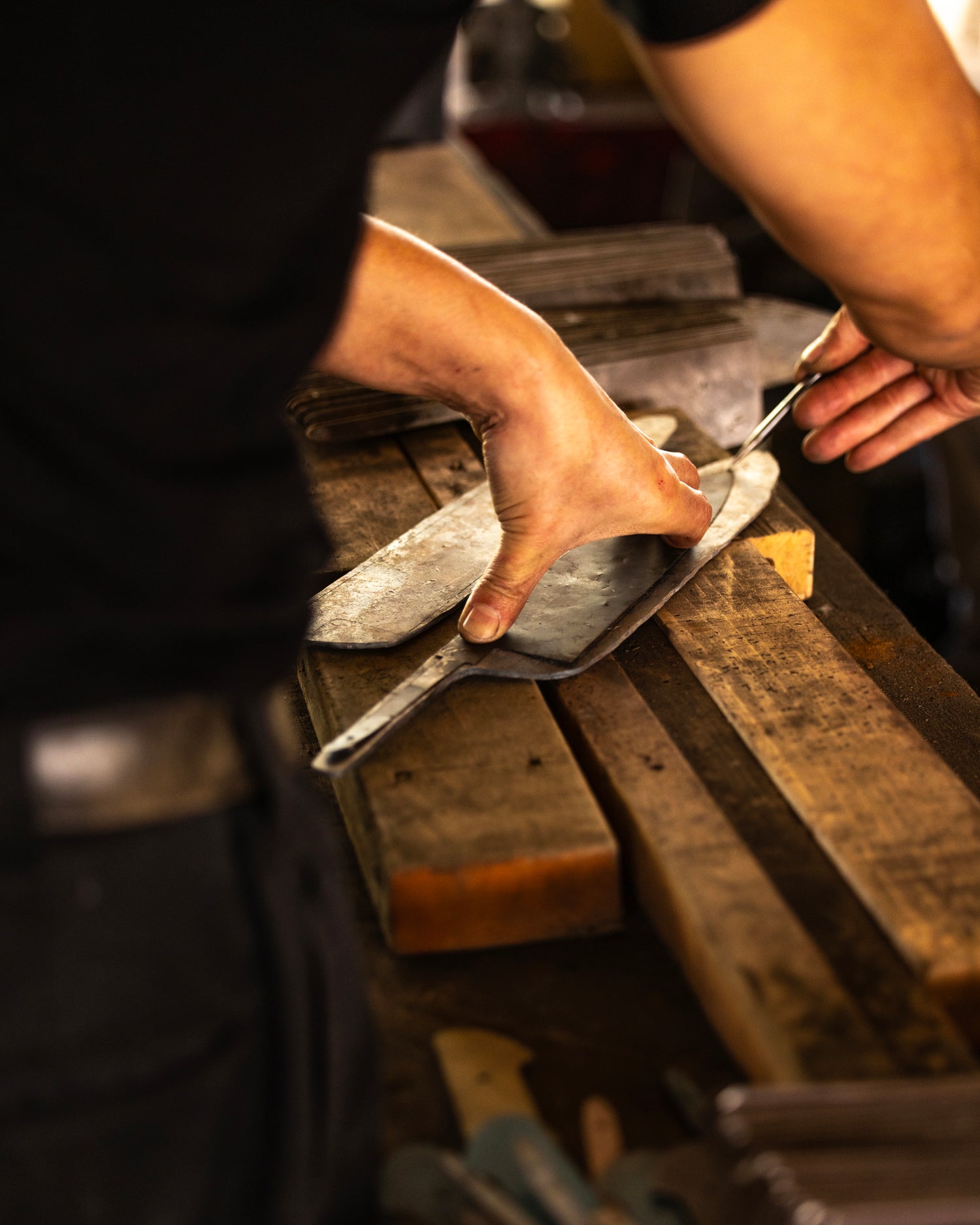 La lame est soigneusement façonnée pour obtenir son profil définitif. Cela inclut la formation de la pointe, du dos et de la soie qui est la partie insérée dans le manche.