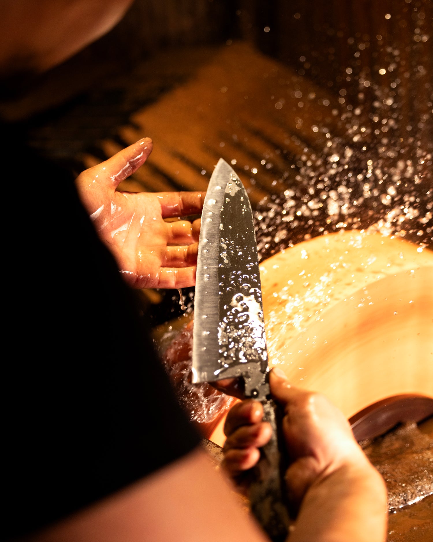 La lame est polie et affûtée manuellement sur des pierres à aiguiser japonaises, souvent naturelles, pour obtenir un tranchant rasoir et une finition esthétique.