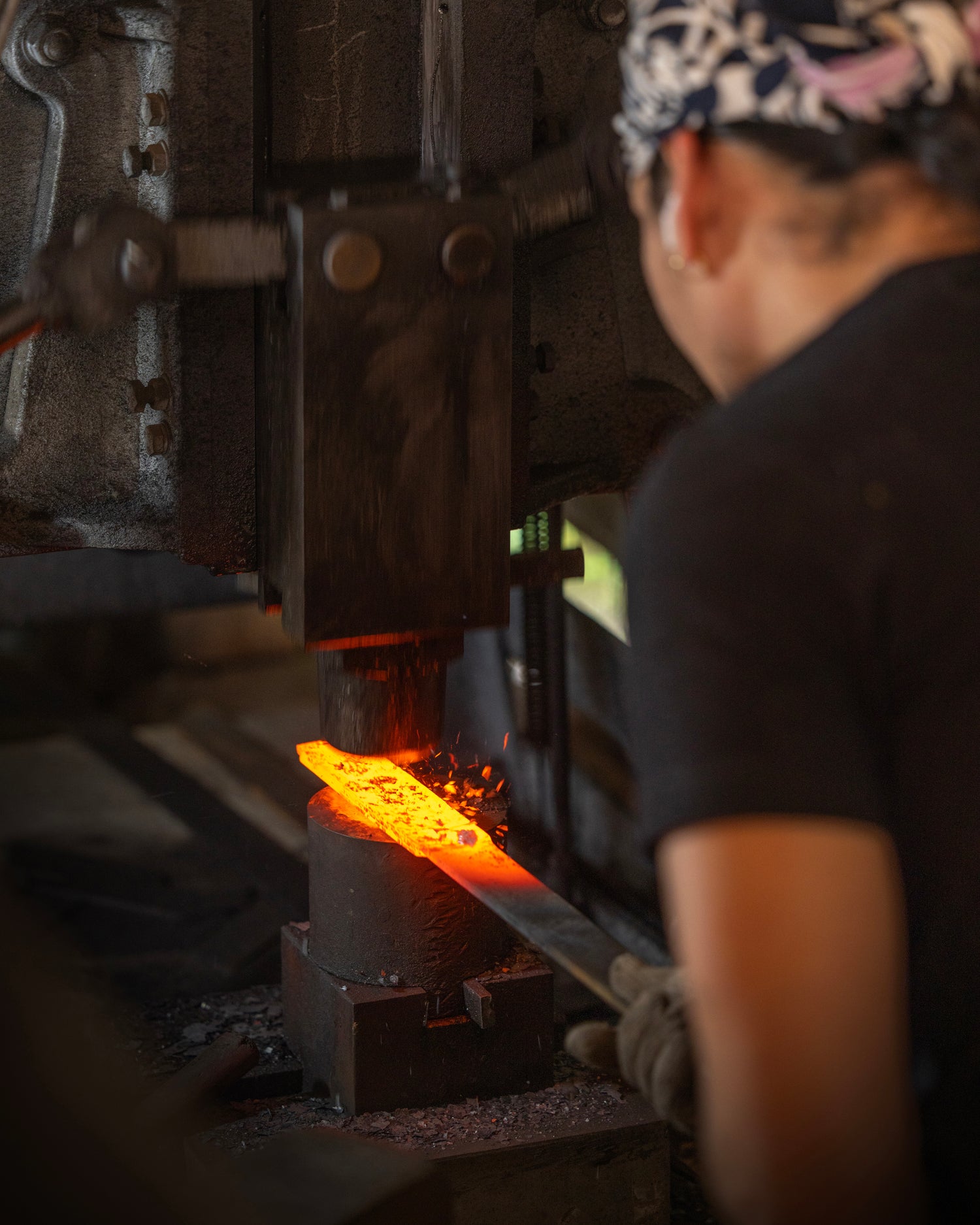 Le bloc d'acier laminé est chauffé à haute température, puis martelé pour lui donner sa forme générale. Ce processus affine la structure interne du métal, améliorant sa densité et sa résistance.