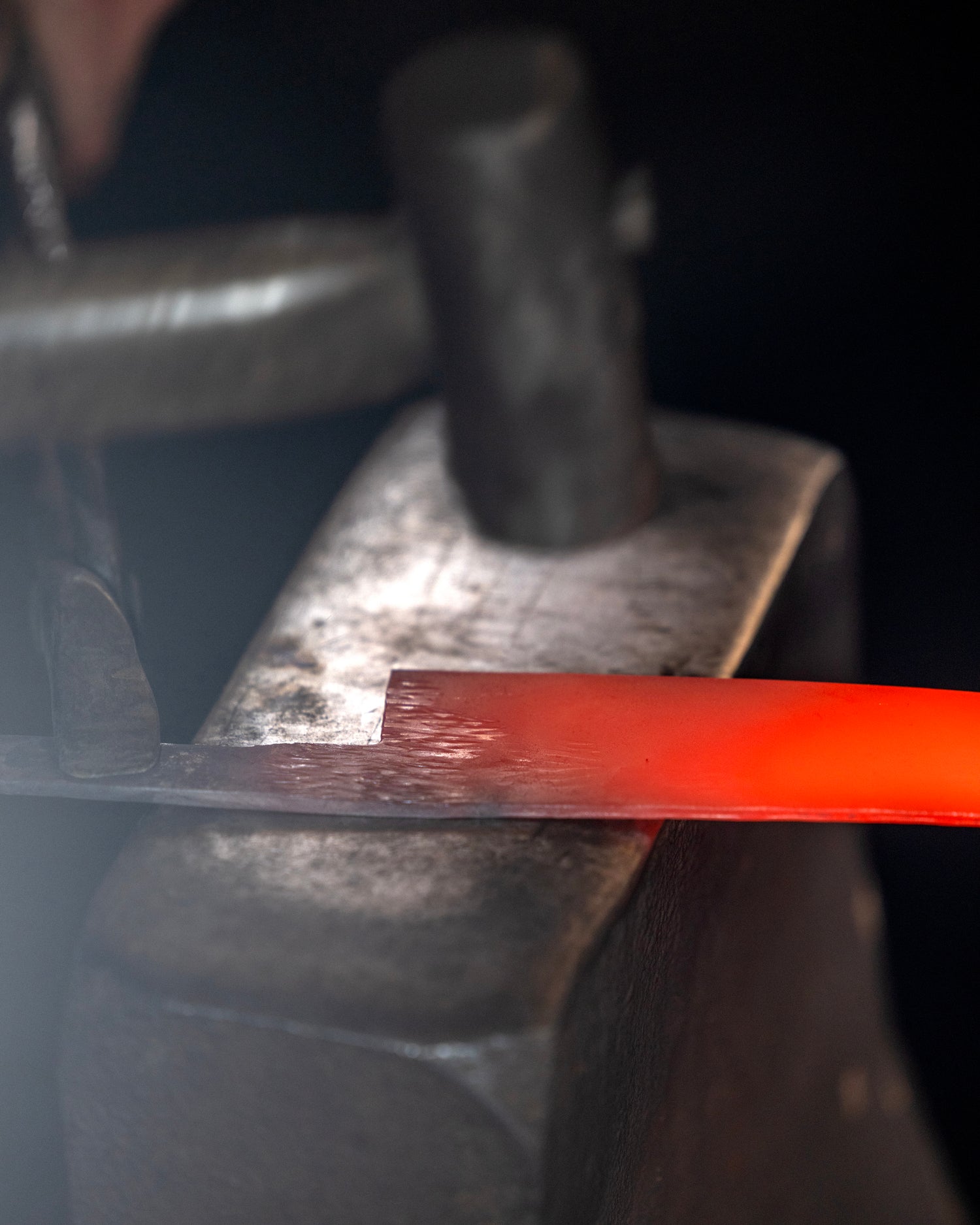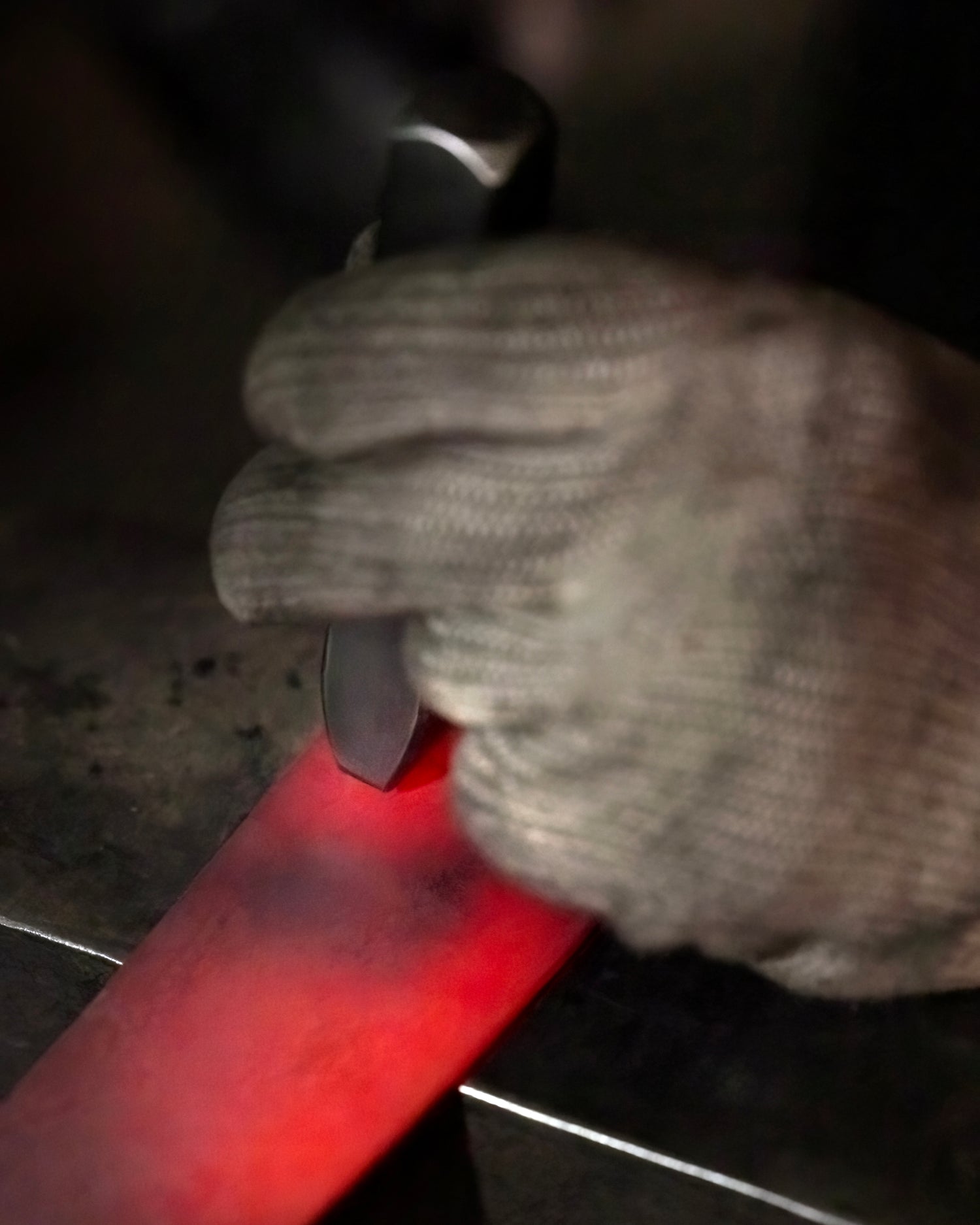Après l'étape de forge initiale, la lame est martelée pour uniformiser son épaisseur et corriger d'éventuelles déformations. Cette étape prépare la lame pour les traitements thermiques ultérieurs.